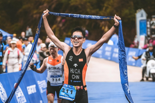实力强劲的上海欢乐铁三俱乐部选手胡琛昊在自行车赛段后来居上,迅速完成超越并一路领先至终点。最终,胡琛昊以1小时56分56秒的成绩夺得男子全程组冠军,这也是他连续第三场比赛实现“破二”(突破两小时大关)。